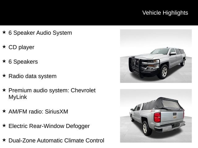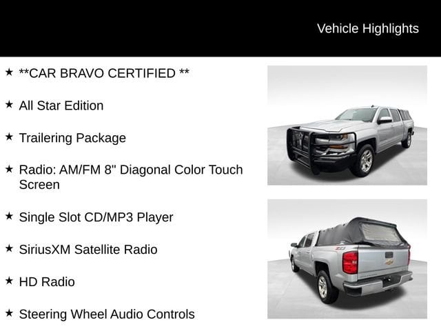 **CAR BRAVO CERTIFIED **, 6-Speed Automatic Electronic with Overdrive, 4WD, Black Cloth, 10-Way Power Driver's Seat Adjuster, 110-Volt AC Power Outlet, 150 Amp Alternator, 4-Wheel Disc Brakes, 4.2 Diagonal Color Display Driver Info Center, 40/20/40 Front Split Bench Seat, 6 Speaker Audio System, 6 Speakers, ABS brakes, Air Conditioning, All Star Edition, Alloy wheels, AM/FM radio: SiriusXM, Auxiliary External Transmission Oil Cooler, Bluetooth® For Phone, Body Color Bodyside Moldings, Body-Color Door Handles, Body-Color Mirror Caps, Body-Color Power Adjustable Heated Outside Mirrors, Bodyside moldings, Brake assist, CD player, Chevrolet Connected Access, Chevrolet w/4G LTE, Cloth Seat Trim, Color-Keyed Carpeting w/Rubberized Vinyl Floor Mats, Compass, Deep-Tinted Glass, Delay-off headlights, Driver & Front Passenger Illuminated Vanity Mirrors, Driver door bin, Driver vanity mirror, Dual front impact airbags, Dual front side impact airbags, Dual-Zone Automatic Climate Control, Electric Rear-Window Defogger, Electronic Stability Control, Exterior Parking Camera Rear, EZ Lift & Lower Tailgate, Front anti-roll bar, Front Center Armrest w/Storage, Front Chrome Bumper, Front License Plate Kit, Front reading lights, Front wheel independent suspension, Fully automatic headlights, HD Radio, Heated door mirrors, Heated Driver & Front Passenger Seats, Heavy-Duty Rear Locking Differential, High-Intensity Discharge Headlights, Illuminated entry, Integrated Trailer Brake Controller, Leather Wrapped Steering Wheel w/Cruise Controls, Low tire pressure warning, Manual Tilt Wheel Steering Column, Manual Tilt/Telescoping Steering Column, Occupant sensing airbag, OnStar & Chevrolet Connected Services Capable, Outside temperature display, Overhead airbag, Overhead console, Panic alarm, Passenger door bin, Passenger vanity mirror, Power door mirrors, Power steering, Power windows, Power Windows w/Driver Express Up, Premium audio system: Chevrolet MyLink, Radio data system, Radio: AM/FM 8 Diagonal Color Touch Screen, Rear 60/40 Folding Bench Seat (Folds Up), Rear Chrome Bumper, Rear reading lights, Rear seat center armrest, Rear step bumper, Rear Wheelhouse Liners, Remote Keyless Entry, Remote keyless entry, Remote Locking Tailgate, Remote Vehicle Starter System, Single Slot CD/MP3 Player, SiriusXM Satellite Radio, Speed control, Speed-sensing steering, Split folding rear seat, Spray-On Pickup Box Bed Liner, Steering Wheel Audio Controls, Steering wheel mounted audio controls, Tachometer, Theft Deterrent System (Unauthorized Entry), Thin Profile LED Fog Lamps, Tilt steering wheel, Traction control, Trailering Package, Trip computer, Variably intermittent wipers, Voltmeter.