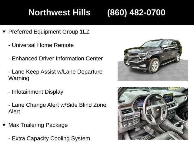 **CAR BRAVO CERTIFIED **, **Clean Carfax**, **4 Wheel Drive**, Bluetooth Phone/Audio, **Apple car play / Android Auto**, **LOCALLY OWNED AND TRADED**, Tahoe Premier, 4D Sport Utility, EcoTec3 5.3L V8, 10-Speed Automatic with Overdrive, 4WD, Black, Jet Black Leather, 10 Speakers, 12-Way Power Driver & Passenger Seat Adjusters, 15 Diagonal Multi-Color Head-Up Display, 1st & 2nd Row Color-Keyed Carpeted Floor Mats, 2 USB Data Ports, 2-Speed Active Electronic AutoTrac Transfer Case, 20 x 9 Polished Aluminum Wheels, 2nd Row Pwr Release 60/40 Split-Folding Bench Seat, 3.23 Rear Axle Ratio, 3rd Row 60/40 Power-Folding Split-Bench Seat, 3rd row seats: split-bench, 4-Wheel Disc Brakes, ABS brakes, Adaptive suspension, Advanced Trailering Package, Advanced Trailering System, Air Conditioning, Alloy wheels, AM/FM radio: SiriusXM with 360L, Apple CarPlay/Android Auto, Auto High-beam Headlights, Auto-dimming door mirrors, Auto-Dimming Inside Rear-View Mirror, Auto-dimming Rear-View mirror, Auto-leveling suspension, Automatic Heated Steering Wheel, Automatic temperature control, Bose 10-Speaker Centerpoint Surround Audio Sys Ft, Brake assist, Bright Front & Rear Door Sill Plates, Bumpers: body-color, Chrome Door Handles w/Body-Color Strip, Chrome Mirror Caps, Color-Keyed Carpeting Floor Covering, Compass, Delay-off headlights, Driver & Front Outboard Passenger Airbags, Driver door bin, Driver vanity mirror, Dual Exhaust System, Dual front impact airbags, Dual front side impact airbags, Electronic Stability Control, Emergency communication system: OnStar and Chevrolet connected services capable, Enhanced Display & Alert Package, Enhanced Driver Information Center, Extra Capacity Cooling System, Floor Console w/Storage Area, Four wheel independent suspension, Front & Rear Park Assist, Front anti-roll bar, Front Bucket Seats, Front Center Armrest, Front dual zone A/C, Front High-Back Reclining Bucket Seats, Front reading lights, Fully automatic headlights, Garage door transmitter, Hands-Free Rear Power Programmable Liftgate, HD Radio, HD Surround Vision, Heated & Ventilated Driver & Front Passenger Seats, Heated 2nd Row Outboard Seats, Heated door mirrors, Heated Driver & Front Passenger Seats, Heated front seats, Heated rear seats, Heated steering wheel, Hill Descent Control, Hitch Guidance w/Hitch View, Illuminated entry, Infotainment Display, Inside Rearview Auto-Dimming Rear Camera Mirror, Integrated Trailer Brake Controller, Lane Change Alert w/Side Blind Zone Alert, Lane Keep Assist w/Lane Departure Warning, Leather steering wheel, Leather-Wrapped Steering Wheel, LED Daytime Running Lamps, License Plate Front Mounting Package, Low tire pressure warning, Magnetic Ride Control Suspension, Max Trailering Package, Memory seat, Memory Settings, Navigation System, Occupant sensing airbag, Outside Heated Power-Adjustable Mirrors, Outside temperature display, Overhead airbag, Overhead console, Panic alarm, Passenger door bin, Passenger vanity mirror, Perforated Leather Seat Trim, Power door mirrors, Power driver seat, Power Liftgate, Power passenger seat, Power Release 2nd Row Bucket Seats, Power steering, Power Tilt & Telescopic Steering Column, Power windows, Preferred Equipment Group 1LZ, Premium audio system: Chevrolet Infotainment 3, Radio: Chevrolet Infotainment 3 Premium System, Rain sensing wipers, Rear air conditioning, Rear anti-roll bar, Rear Camera Mirror Washer, Rear Cross Traffic Alert, Rear Pedestrian Alert, Rear reading lights, Rear window defroster, Rear window wiper, Remote keyless entry, Remote Start, Roof rack: rails only, Safety Alert Seat, Security system, Set of 4 Wheel Locks (LPO), SiriusXM NavTraffic, SiriusXM Radio w/360L, Speed control, Speed-sensing steering, Split folding rear seat, Spoiler, Steering wheel memory, Steering wheel mounted audio controls, Tachometer, Telescoping steering wheel, Tilt steering wheel, Traction control, Tr