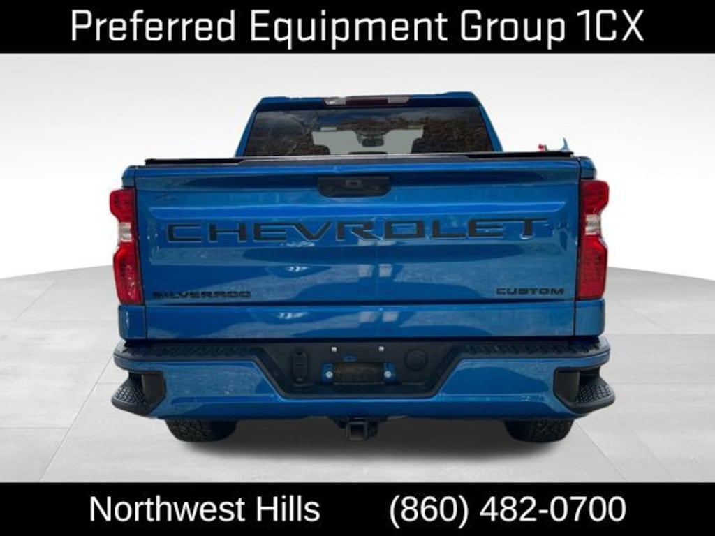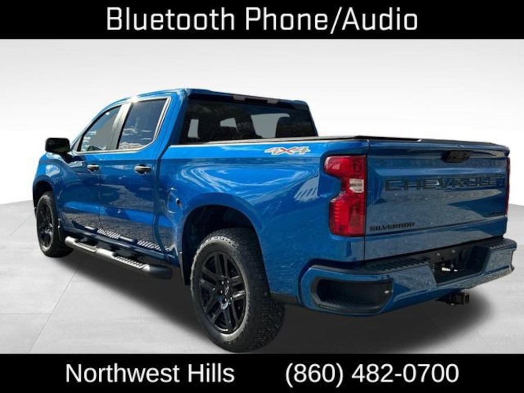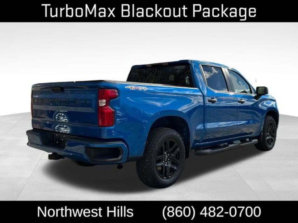 **4 Wheel Drive**, Bluetooth Phone/Audio, Silverado 1500 Custom, 4D Crew Cab, 2.7L I4 Turbocharged DOHC 16V LEV3-SULEV30 310hp, 8-Speed Automatic, 4WD, Glacier Blue Metallic, Black Cloth, 10-Way Power Driver Seat w/Lumbar, 120-Volt Interior Power Outlet, 3.42 Rear Axle Ratio, 3.5 Monochromatic Display Driver Info Center, 4-Wheel Disc Brakes, 4 Black Round Assist Steps (LPO), 6-Speaker Audio System, ABS brakes, Air Conditioning, Alloy wheels, AM/FM radio: SiriusXM, Auto High-beam Headlights, Black Name Plates (LPO), Bluetooth® For Phone, Color-Keyed Carpeting Floor Covering, Custom Convenience Package, Custom Value Package, Dark Essentials Package (LPO), Deep-Tinted Glass, Delay-off headlights, Driver door bin, Driver vanity mirror, Dual front impact airbags, Dual front side impact airbags, Dual Rear USB Ports (Charge Only), Electric Rear-Window Defogger, Electrical Steering Column Lock, Electronic Cruise Control, Electronic Stability Control, EZ Lift Power Lock & Release Tailgate, Following Distance Indicator, Forward Collision Alert, Front Frame-Mounted Black Recovery Hooks, Front Pedestrian Braking, Front reading lights, Front Rubberized Vinyl Floor Mats, Fully automatic headlights, HD Rear Vision Camera, High Capacity Suspension Package, LED Cargo Area Lighting, Manual Tilt Wheel Steering Column, OnStar & Chevrolet Connected Services Capable, Overhead console, Passenger vanity mirror, Power driver seat, Power Front Windows w/Driver Express Up/Down, Power Front Windows w/Passenger Express Down, Power Rear Windows w/Express Down, Power steering, Power windows, Preferred Equipment Group 1CX, Premium audio system: Chevrolet Infotainment 3, Radio data system, Radio: Chevrolet Infotainment 3 System, Rear 60/40 Folding Bench Seat (Folds Up), Rear window defroster, Remote Keyless Entry, Remote Vehicle Starter System, SiriusXM Radio, Speed-sensing steering, Standard Tailgate, Theft Deterrent System (Unauthorized Entry), Tilt steering wheel, Traction control, Trailering Package, TurboMax Blackout Package, Variably intermittent wipers, Wheels: 20 x 9 High Gloss Black Painted Alum.