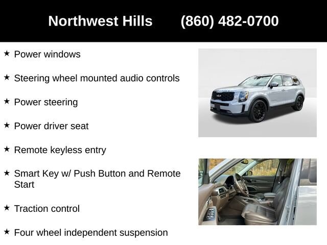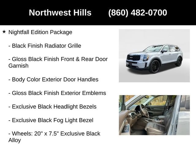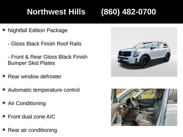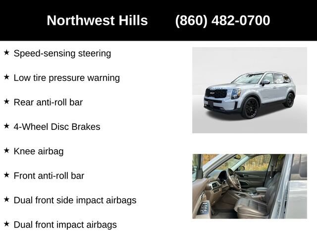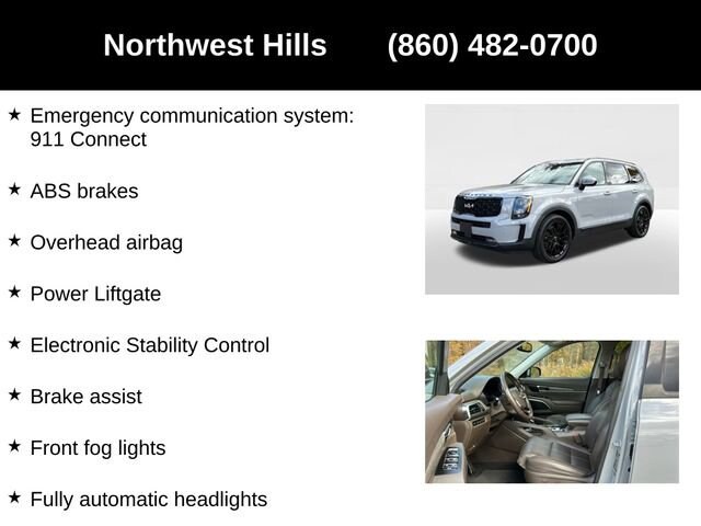 2022 Kia Telluride SX**CAR BRAVO CERTIFIED **, **Clean Carfax**, **All Wheel Drive**, Bluetooth Phone/Audio, **Apple car play / Android Auto**, THIRD ROW SEATING/7 PASSENGER SEATING, 3.648 Axle Ratio, 3rd row seats: split-bench, 4-Wheel Disc Brakes, ABS brakes, Air Conditioning, Auto High-beam Headlights, Automatic temperature control, Black Finish Radiator Grille, Body Color Exterior Door Handles, Brake assist, Delay-off headlights, Dual front impact airbags, Dual front side impact airbags, Electronic Stability Control, Emergency communication system: 911 Connect, Exclusive Black Fog Light Bezel, Exclusive Black Headlight Bezels, Four wheel independent suspension, Front & Rear Gloss Black Finish Bumper Skid Plates, Front anti-roll bar, Front Bucket Seats, Front Center Armrest, Front dual zone A/C, Front fog lights, Fully automatic headlights, Gloss Black Finish Exterior Emblems, Gloss Black Finish Front & Rear Door Garnish, Gloss Black Finish Roof Rails, Heated & Ventilated Front Bucket Seats, Heated front seats, Knee airbag, Leather Seat Trim, Low tire pressure warning, Memory seat, Navigation System, Nightfall Edition Package, Overhead airbag, Power driver seat, Power Liftgate, Power passenger seat, Power steering, Power windows, Rear air conditioning, Rear anti-roll bar, Rear window defroster, Rear window wiper, Reclining 3rd row seat, Remote keyless entry, Smart Key w/ Push Button and Remote Start, Speed-sensing steering, Split folding rear seat, Steering wheel mounted audio controls, Traction control, Variably intermittent wipers, Ventilated front seats, Wheels: 20 x 7.5 Exclusive Black Alloy.Say Yes to Sullivan! Our Dealer Conveyance fee is only $479!